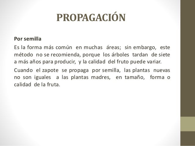 - 10. PROPAGACIÓN Por semilla Es la forma más común en muchas áreas; sin embargo, este método no se recomienda, porque los árboles tardan de siete a más años para producir, y la calidad del fruto puede variar. Cuando el zapote se propaga por semilla, las plantas nuevas no son iguales a las plantas madres, en tamaño, forma o calidad de la fruta.