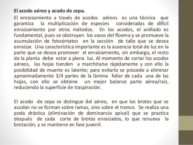 - 11. El acodo aéreo y acodo de cepa. El enraizamiento a través de acodos aéreos es una técnica que garantiza la multiplicación de especies consideradas de difícil enraizamiento por otros métodos. En los acodos, el anillado es fundamental, pues se obstruyen los vasos del floema y se promueve la acumulación de fotosintatos en la sección de tallo que se desea enraizar. Una característica importante es la ausencia total de luz en la parte que se desea promover el enraizamiento, sin embargo, el resto de la planta debe estar a plena luz. Al momento de cortar los acodos aéreos, las hojas tienden a marchitarse rápidamente y con ello la posibilidad de muerte es latente; para evitarlo se procede a eliminar aproximadamente 3/4 partes de la lámina foliar de cada una de las hojas, con ello se obtiene un mejor balance parte aérea/raíz, reduciendo la superficie de traspiración. El acodo de cepa se distingue del aéreo, en que los brotes que se acodan no se forman sobre ramas, sino sobre el tronco. Se realiza una poda drástica (eliminación de dominancia apical) que se practica después de cada corte de brotes enraizados, lo que renueva la brotación, y se mantiene en fase juvenil.