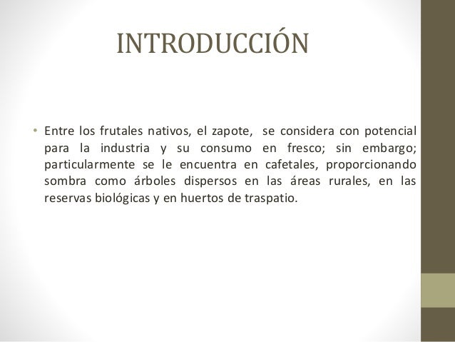 - 2. INTRODUCCIÓN • Entre los frutales nativos, el zapote, se considera con potencial para la industria y su consumo en fresco; sin embargo; particularmente se le encuentra en cafetales, proporcionando sombra como árboles dispersos en las áreas rurales, en las reservas biológicas y en huertos de traspatio.