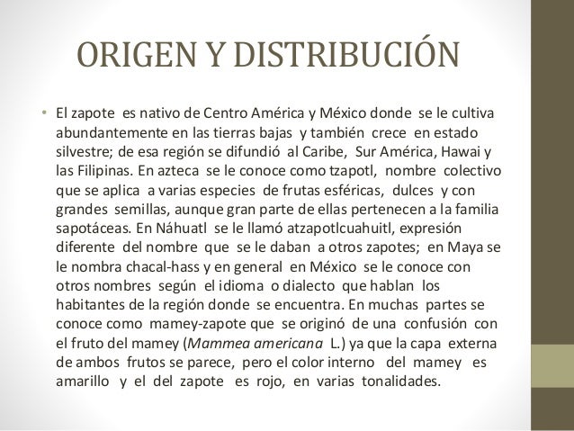 - 3. ORIGEN Y DISTRIBUCIÓN • El zapote es nativo de Centro América y México donde se le cultiva abundantemente en las tierras bajas y también crece en estado silvestre; de esa región se difundió al Caribe, Sur América, Hawai y las Filipinas. En azteca se le conoce como tzapotl, nombre colectivo que se aplica a varias especies de frutas esféricas, dulces y con grandes semillas, aunque gran parte de ellas pertenecen a la familia sapotáceas. En Náhuatl se le llamó atzapotlcuahuitl, expresión diferente del nombre que se le daban a otros zapotes; en Maya se le nombra chacal-hass y en general en México se le conoce con otros nombres según el idioma o dialecto que hablan los habitantes de la región donde se encuentra. En muchas partes se conoce como mamey-zapote que se originó de una confusión con el fruto del mamey (Mammea americana L.) ya que la capa externa de ambos frutos se parece, pero el color interno del mamey es amarillo y el del zapote es rojo, en varias tonalidades.