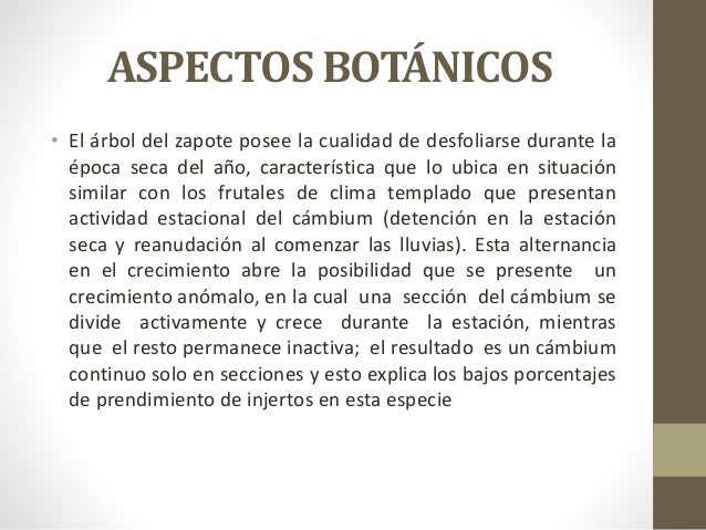 - 4. ASPECTOS BOTÁNICOS • El árbol del zapote posee la cualidad de desfoliarse durante la época seca del año, característica que lo ubica en situación similar con los frutales de clima templado que presentan actividad estacional del cámbium (detención en la estación seca y reanudación al comenzar las lluvias). Esta alternancia en el crecimiento abre la posibilidad que se presente un crecimiento anómalo, en la cual una sección del cámbium se divide activamente y crece durante la estación, mientras que el resto permanece inactiva; el resultado es un cámbium continuo solo en secciones y esto explica los bajos porcentajes de prendimiento de injertos en esta especie