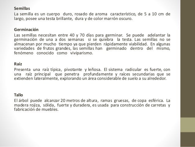 - 5. Semillas La semilla es un cuerpo duro, rosado de aroma característico, de 5 a 10 cm de largo, posee una testa brillante, dura y de color marrón oscuro. Germinación Las semillas necesitan entre 40 y 70 días para germinar. Se puede adelantar la germinación de una a dos semanas si se quiebra la testa. Las semillas no se almacenan por mucho tiempo ya que pierden rápidamente viabilidad. En algunas variedades de frutos grandes, las semillas han germinado dentro del mismo, fenómeno conocido como viviparismo. Raíz Presenta una raíz típica, pivotante y leñosa. El sistema radicular es fuerte, con una raíz principal que penetra profundamente y raíces secundarias que se extienden lateralmente, explorando un área considerable de suelo a su alrededor. Tallo El árbol puede alcanzar 20 metros de altura, ramas gruesas, de copa esférica. La madera rojiza, sólida, fuerte y duradera, es usada para construcción de carretas y fabricación de muebles.