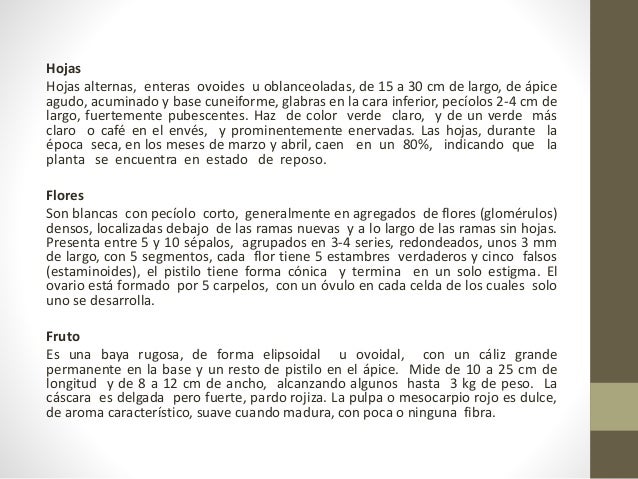 - 6. Hojas Hojas alternas, enteras ovoides u oblanceoladas, de 15 a 30 cm de largo, de ápice agudo, acuminado y base cuneiforme, glabras en la cara inferior, pecíolos 2-4 cm de largo, fuertemente pubescentes. Haz de color verde claro, y de un verde más claro o café en el envés, y prominentemente enervadas. Las hojas, durante la época seca, en los meses de marzo y abril, caen en un 80%, indicando que la planta se encuentra en estado de reposo. Flores Son blancas con pecíolo corto, generalmente en agregados de flores (glomérulos) densos, localizadas debajo de las ramas nuevas y a lo largo de las ramas sin hojas. Presenta entre 5 y 10 sépalos, agrupados en 3-4 series, redondeados, unos 3 mm de largo, con 5 segmentos, cada flor tiene 5 estambres verdaderos y cinco falsos (estaminoides), el pistilo tiene forma cónica y termina en un solo estigma. El ovario está formado por 5 carpelos, con un óvulo en cada celda de los cuales solo uno se desarrolla. Fruto Es una baya rugosa, de forma elipsoidal u ovoidal, con un cáliz grande permanente en la base y un resto de pistilo en el ápice. Mide de 10 a 25 cm de longitud y de 8 a 12 cm de ancho, alcanzando algunos hasta 3 kg de peso. La cáscara es delgada pero fuerte, pardo rojiza. La pulpa o mesocarpio rojo es dulce, de aroma característico, suave cuando madura, con poca o ninguna fibra.